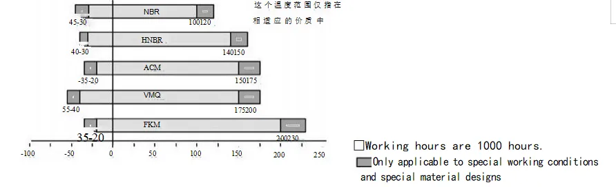 밀봉 효과에 영향을 미치는 요소는 수십 가지입니다. 재료 및 구조와 같은 오일 씰 자체 외에도 매체, 온도, 압력, 윤활, 속도 및 표면 거칠기와 같은 다른 요소도 씰링 효과에 직접적인 영향을 미치며 이러한 요소는 종종 서로 상호 작용합니다. 다음 차트는 사용자 참조용으로만 제공됩니다.